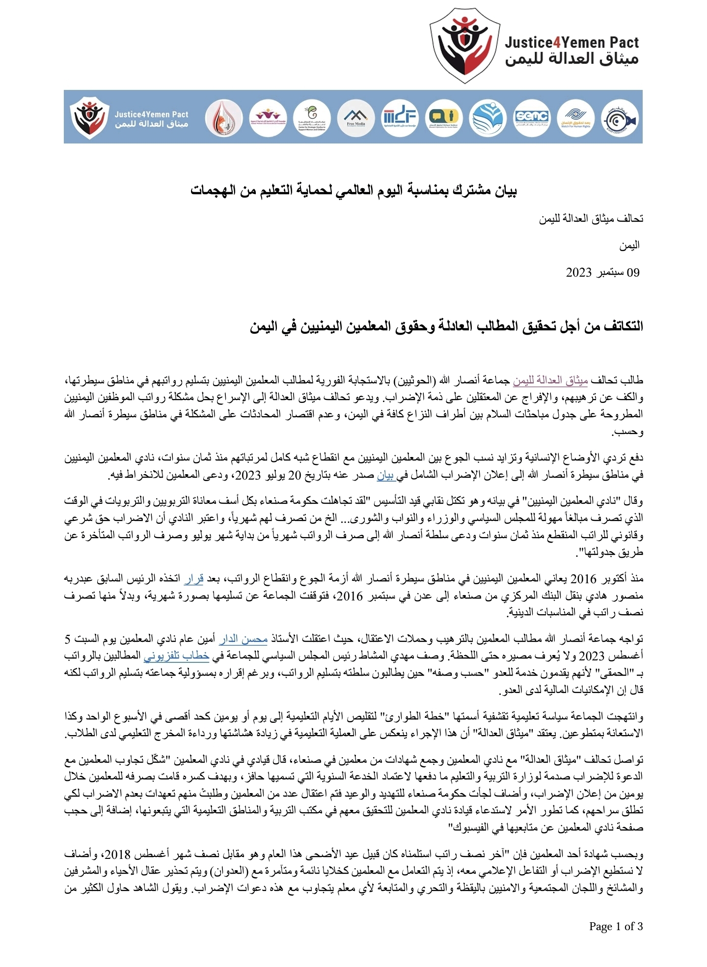 يجدد تحالف ميثاق العدالة لليمن مطالبته لجماعة أنصار الله (الحوثيين) بالاستجابة السريعة لمطالب المعلمين اليمنيين في مناطق سيطرتها بصرف رواتبهم بانتظام وجدولة المتأخرة منها، والافراج الفوري عن المعلمين المعتقلين، والكف عن استخدام الوسائل الأمنية والترهيبية لمواجهة العمل المدني، وضمان تخصيص الموارد التي تتحصلها لتسليم رواتب المعلمين وتحسين العملية التعليمية في مناطق سيطرتها.