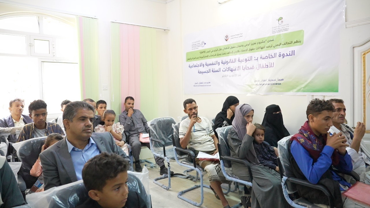 The Yemeni Coalition for Monitoring Human Rights Violations (YCMHRV Rasd Coalition) organized in cooperation with the Center for Strategic Studies to Support Women and Children, members of the Justice Pact Coalition for Yemen, yesterday, Saturday, June 29, 2024, in Taiz, a seminar on legal and psychological awareness for children victims of the six grave violations within the activities of the SAFE project to enhance awareness and ensure children’s rights during conflict in Yemen.