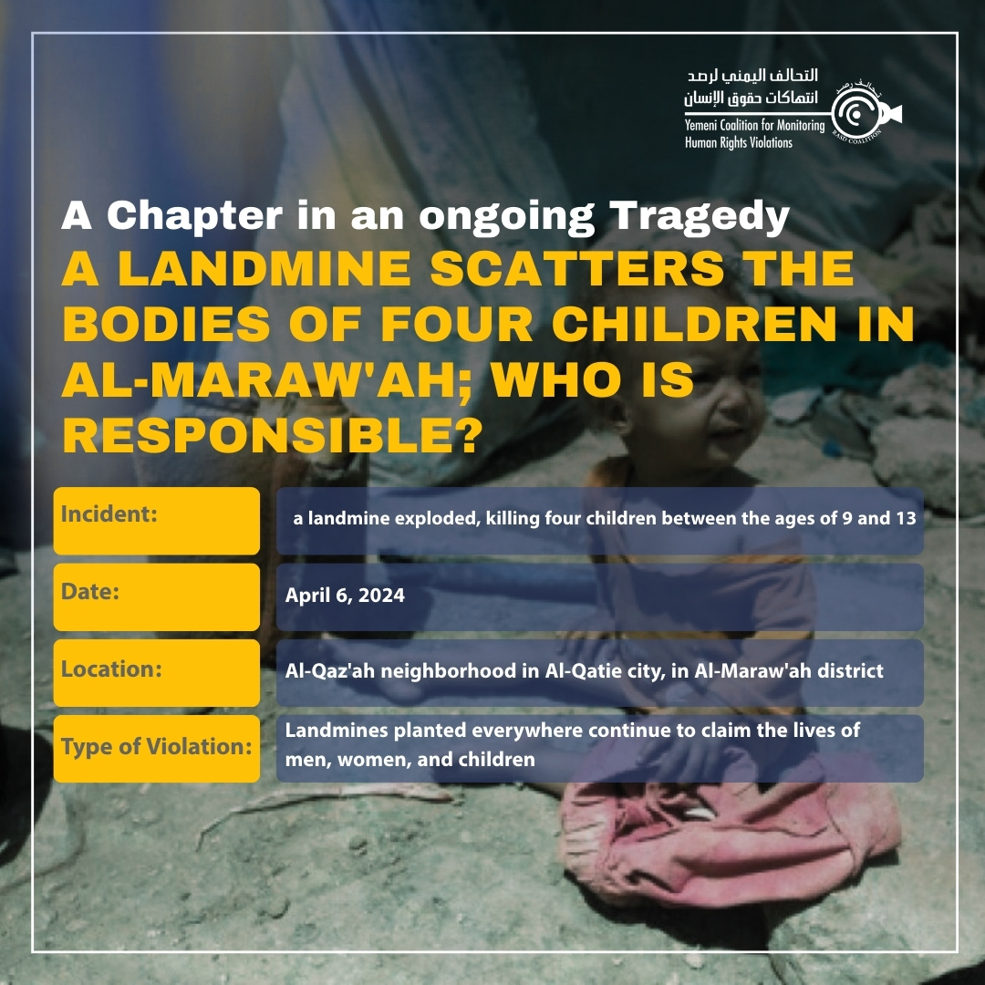 For years, residents of the Hodiedah coast have been living an ongoing tragedy as their lands have been transformed into killing fields. Landmines planted everywhere continue to claim the lives of men, women, and children. On Saturday, April 6, 2024, residents of the Al-Qaz'ah neighborhood in Al-Qatie city, in Al-Maraw'ah district, a landmine exploded, killing four children between the ages of 9 and 13.