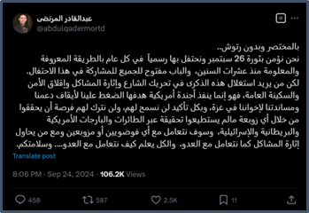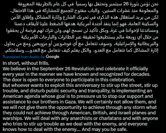 مسؤول ملف الأسرى في جماعة الحوثي، تغريدة في إكس برر فيها جريمة اعتقال الأطفال والشباب الذين احتفلوا بثورة 26 سبتمبر، واتهمهم فيها بالعمالة وقال أنهم يثيرون المشكلات واطلق تهديدات جادة: "سوف نتعامل مع أي فوضويين أو مزوبعين ومع من يحاول إثارة المشاكل كما نتعامل مع العدو".
