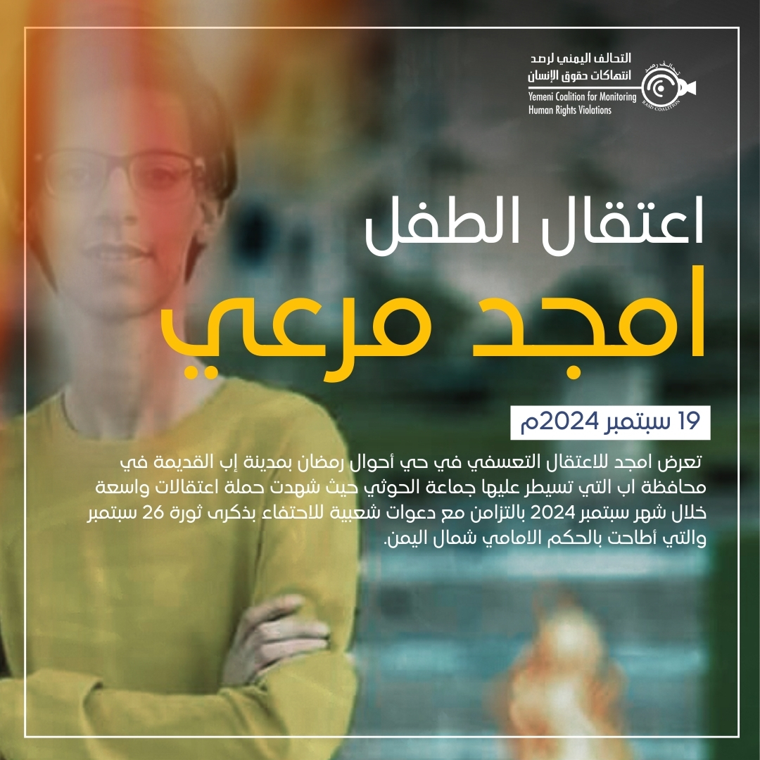 Detention of the child Amjad Marai (17) in September 2024 is not just an isolated incident, but rather a link in a chain of systematic repression practiced by the Houthi group against civilians in Yemen, aimed at silencing any potential opposition. The crackdown and arrests launched during Yemenis' celebrations of the anniversary of the September 26th Revolution, a symbol of the end of the Imamate regime, and which included dozens of children accused of "spreading chaos," clearly reflect the group's brutality, not only toward those who disagree with it but also those who do not believe in it. They also reveal that they do not need any evidence to suppress people, considering the militia’s ability for misinformation and deception, to justify their violations.