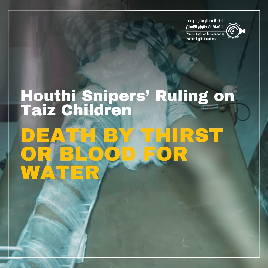 In April 2022, the fighting in Yemen "partially" ceased following a truce brokered by the United Nations, which was announced to last until October of the same year. Fortunately, fighting did not resume in October, and the truce, albeit undeclared, has continued to date. Unfortunately, this was not enough, as the warring parties continued to commit serious violations of international human rights law and international humanitarian law. The siege of Taiz city also continued, and despite the limited opening of one road to civilians a year ago, the suffering of the residents due to the water crisis persists. Indeed, with the ceasefire, violations against civilians in Taiz while fetching water have increased, especially children, as they are targeted by Houthi snipers while traveling to fetch water from areas near the frontline. Days before a Houthi sniper targeted the two children, Suleiman and Mohammed, 16-year-old Mujahid Al-Kadhi was shot in the shoulder by a sniper while he was in the Al-Khadhra neighborhood in Sala district. Two weeks ago, four children were also shot by a Houthi sniper in Sala and Al-Dhabab areas. While Yemen Shabab TV reported that it had documented the killing and wounding of 53 civilians, including children and women, from the beginning of this year until the end of April, most of them in sniper and shelling operations carried out by the Houthi group on villages and neighborhoods in the Taiz districts under the authority of the legitimate government.